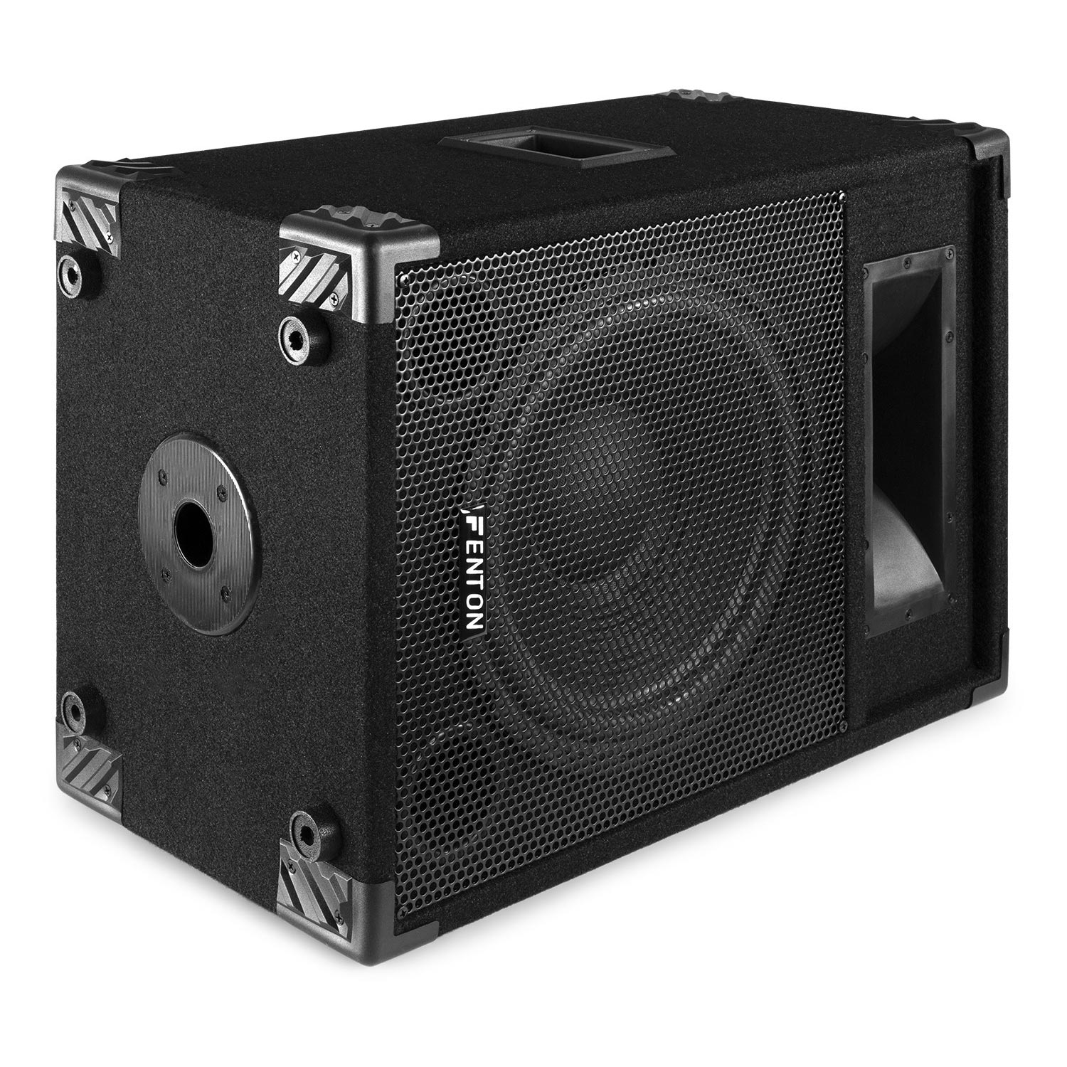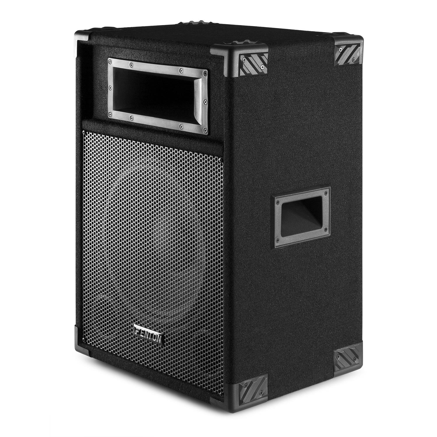 Lej en rektangulær 2-vejs basrefleks-højttaler med en integreret 600W forstærker, en højeffektiv 12" bashøjttaler. Perfekt til musik og lydshow. Anbefales til forsamlinger på ca. 100-150 mennesker.
